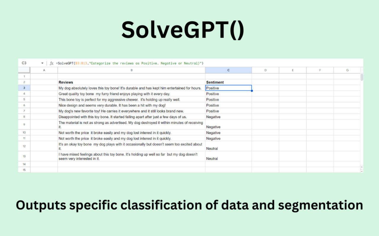 SolveGPT(B3:B15,"Categorize the reviews as Positive, Negative or Neutral")