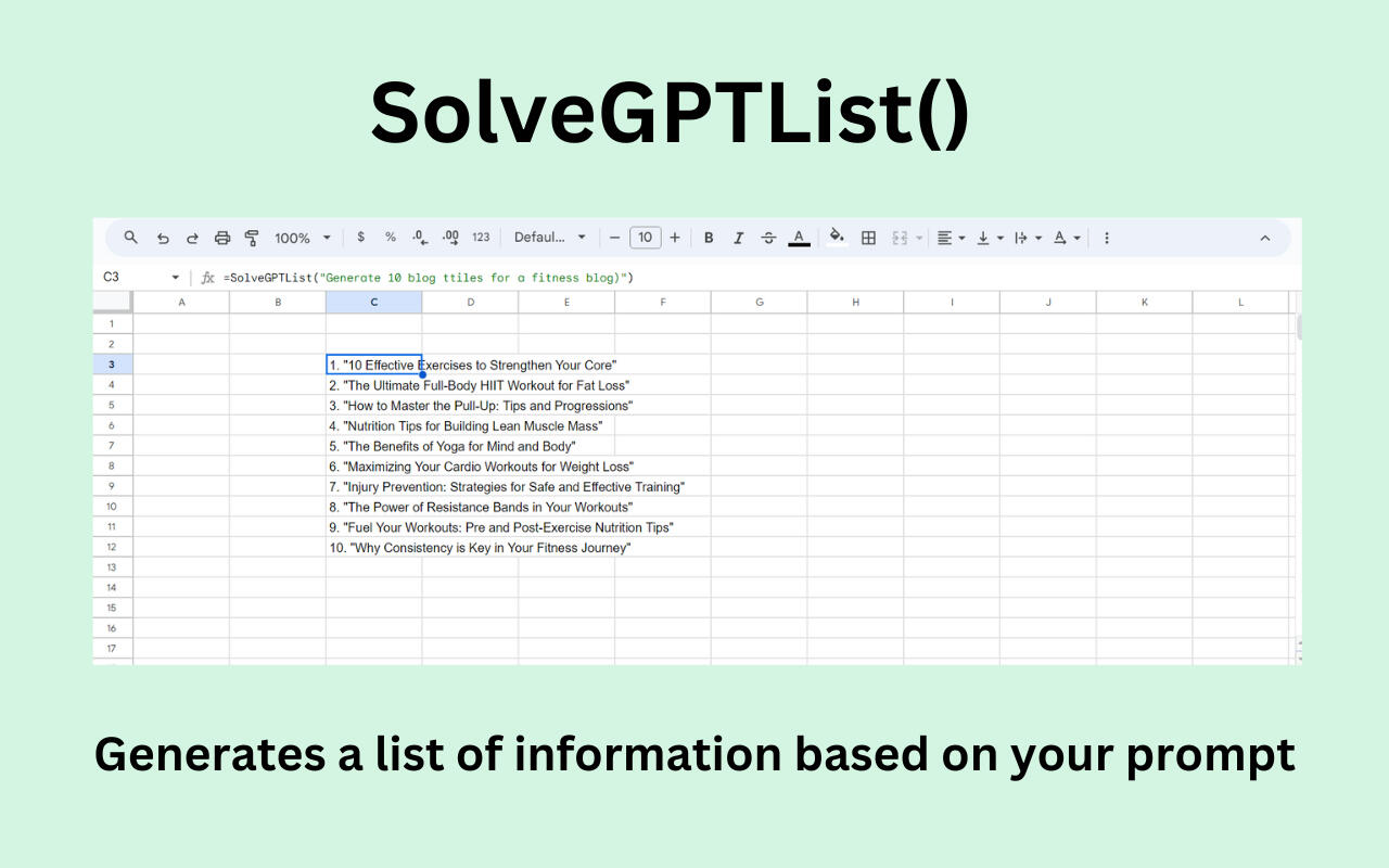 Classify and analyze data for day to day business operations. Become super productive and finish in seconds instead of hours.SolveGPT(B3:B15,"Categorize the reviews as Positive, Negative or Neutral")Create content ideas using ChatGPT directly to your spreadsheet. No need to copy paste content from ChatGPT into spreadsheets.SolveGPTList("Create 10 blog post ideas for a Bali travel website")Generate a table of information for just about anything.=SolveGPTList("Generate a table of 10 users with first name, last name, age and email")Translate data from one language to anotherSolveGPT(A1:A10, "Translate to French","gpt-4")Extract data just with 1 prompt from a complex dataset=SolveGPT(B2:B6,"Extract the name, address, city, state and zip code")Cache data in your spreadsheet and save on OpenAPI costs for subsequent operations using a simple cackeKey=SolveGPT(B3:B13,"Categorize the reviews as Positive, Negative or Neutral","gpt-4","sentiment-101")Generate ImageThis will generate a URL of the image=SolveGPTImage("Generate an image of a jumping Persian cat")This will show the image generated in the cell=IMAGE(SolveGPTImage("Generate an image of a jumping Persian cat"),4,300,300)