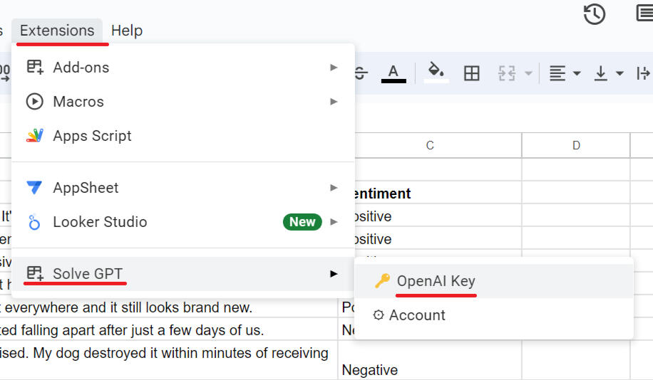 After installation, you will see a “Solve GPT” item under the Extensions menu in your Google sheet.